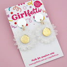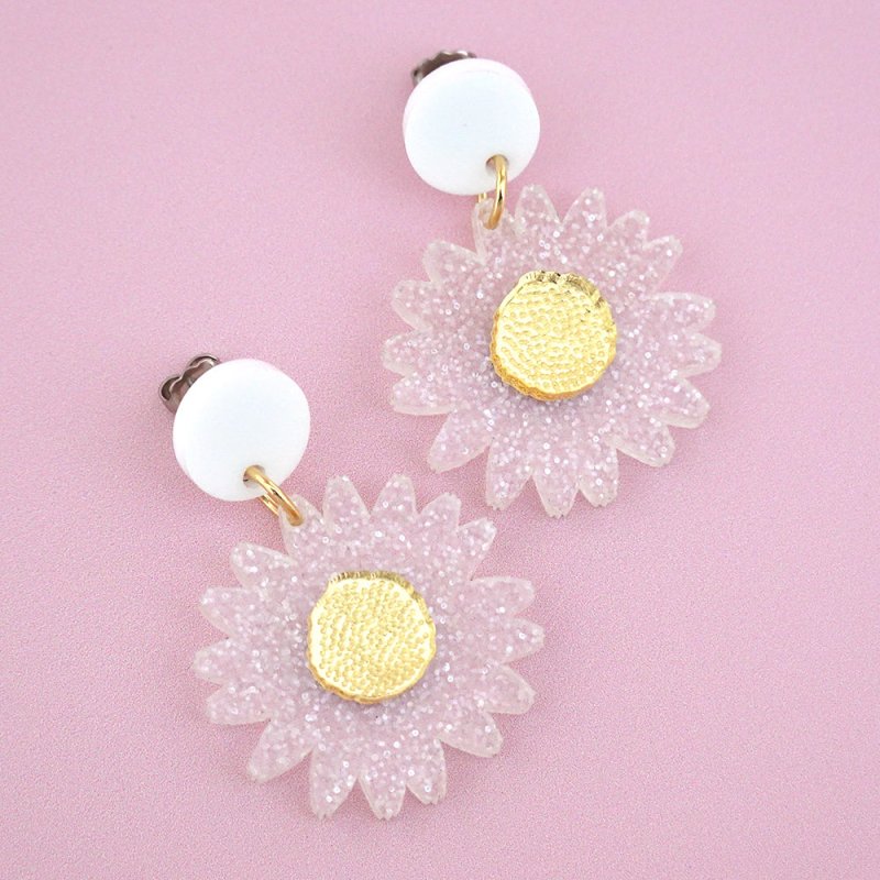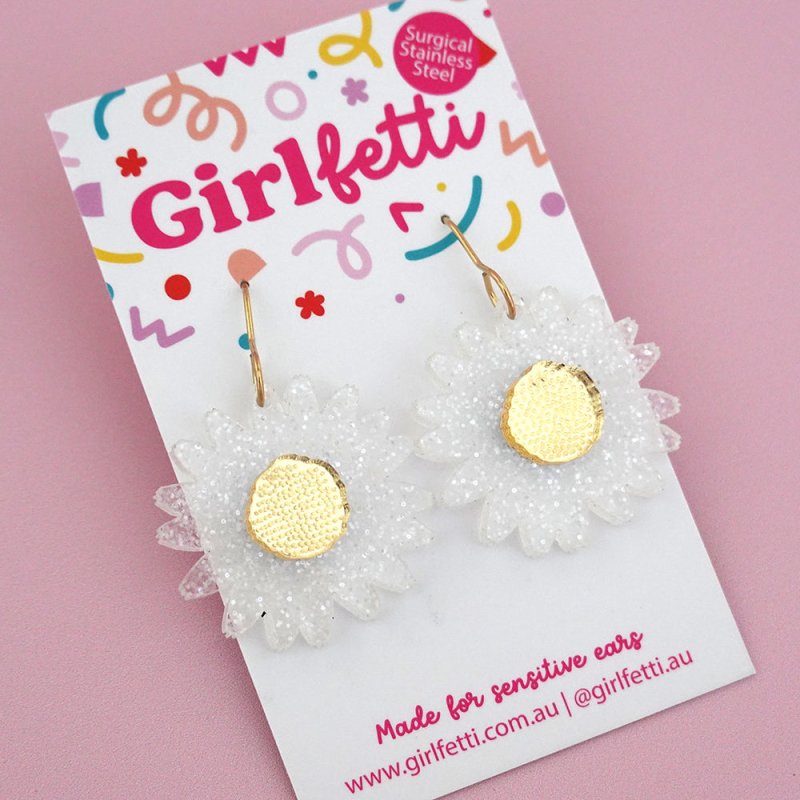 Materials: 3mm premium glitter acrylic base with a 3mm acrylic mirror centre with engraved detail adhered on top. Stud top, hooks and hoops are hypoallergenic 304 stainless steel.