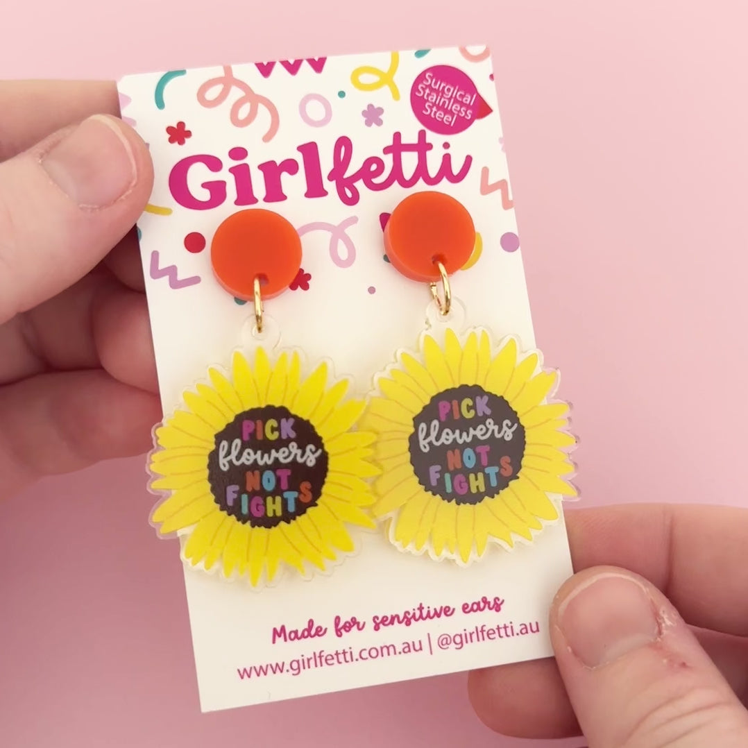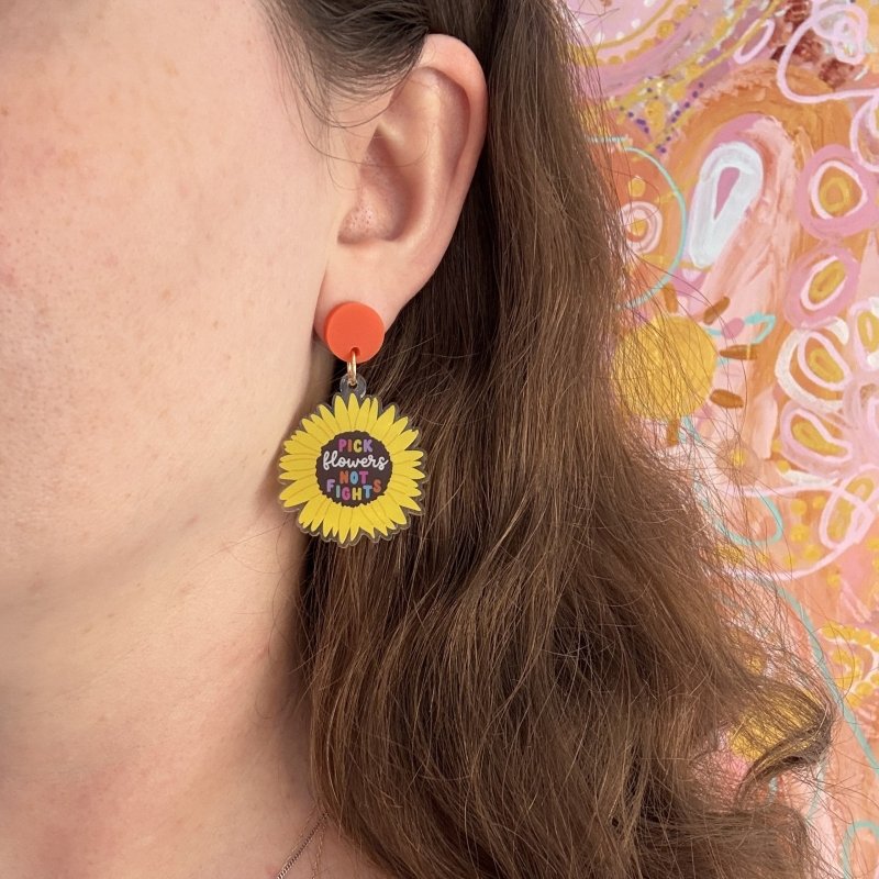 'Pick Flowers, Not Fights' Harmony Day Acrylic Dangle Earrings
