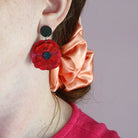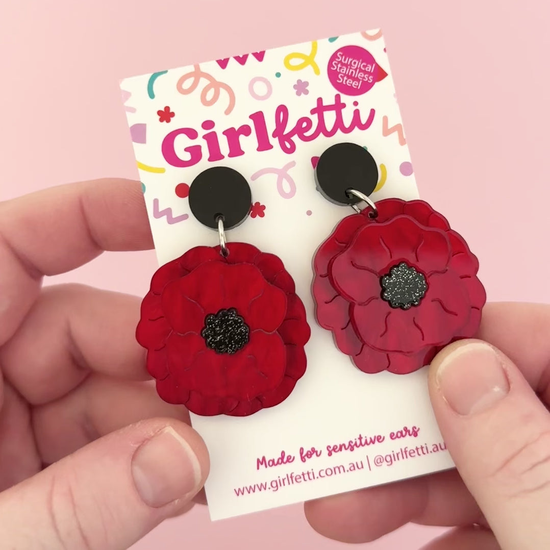 - Red Poppy Dangle - Approximately 35mm (wide) x 49mm (high) in total. Stud top is approximately 13mm in diameter.