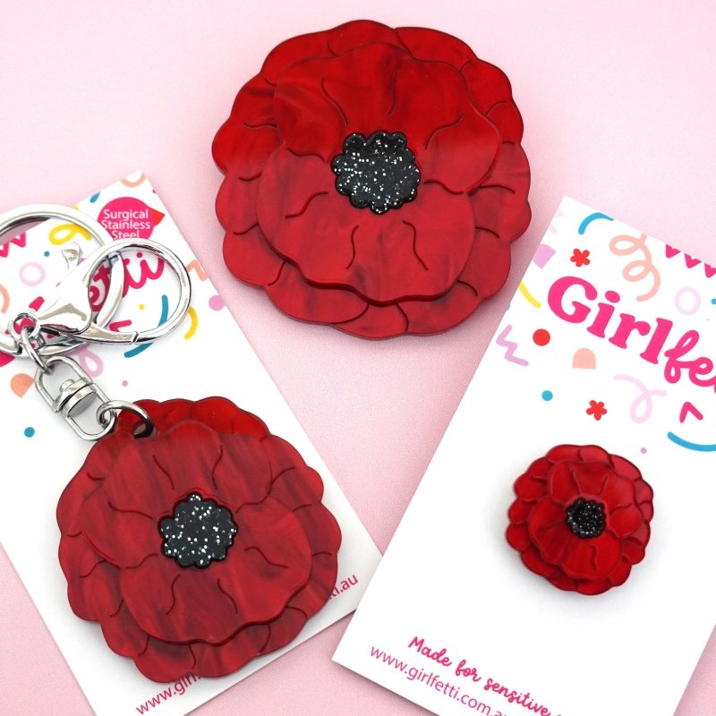 - Material: Poppy is made from 3mm premium swirl acrylic base with 3mm acrylic detailing (glitter and swirl) adhered on top. Keyring is finished with a nickel and lead free iron alloy 30mm diameter keyring and lobster clasp. Brooch is finished with a stainless steel brooch back with locking mechanism. Pin is finished with a lapel pin with locking back.
