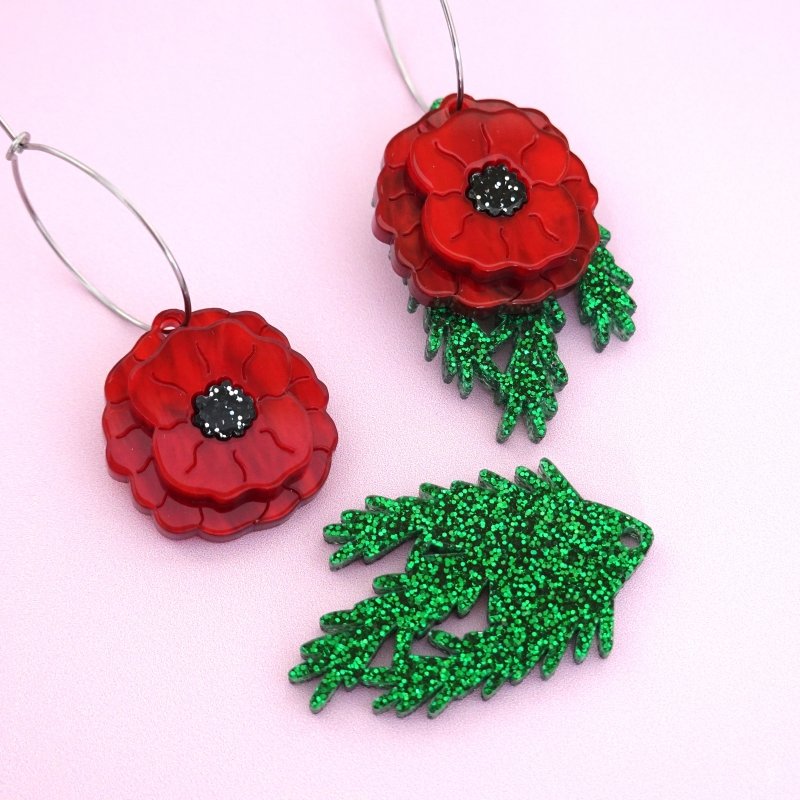 - Material: Poppy is made from 3mm premium swirl acrylic base with 3mm acrylic detailing (glitter and swirl) adhered on top. Rosemary is made from 3mm glitter acrylic. Poppy hoop is made from 3 pieces of lightweight removeable 3mm premium acrylic. Keyring is finished with a nickel and lead free iron alloy 30mm diameter keyring and lobster clasp. Brooch is finished with a stainless steel brooch back with locking mechanism. Pin is finished with a lapel pin with locking back.