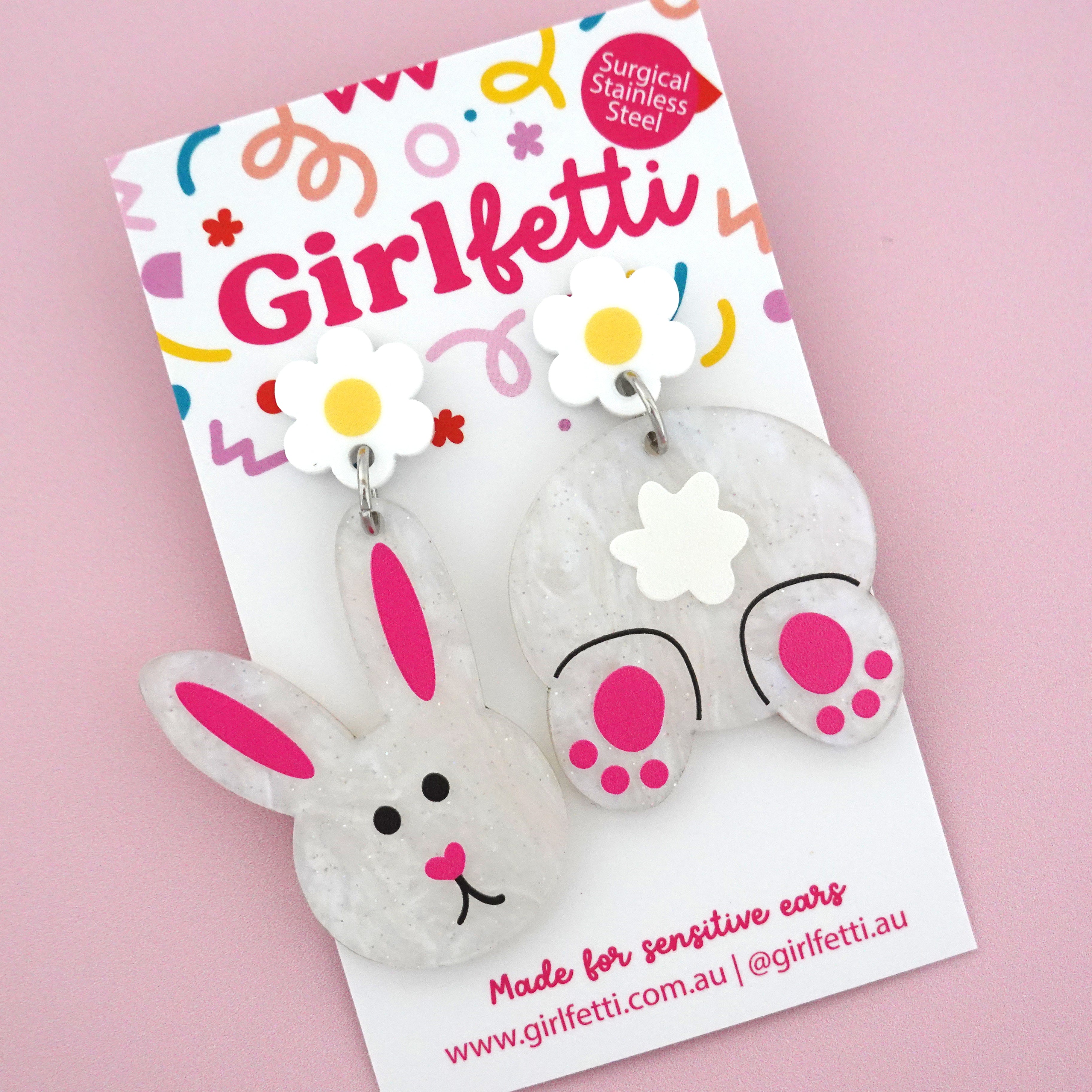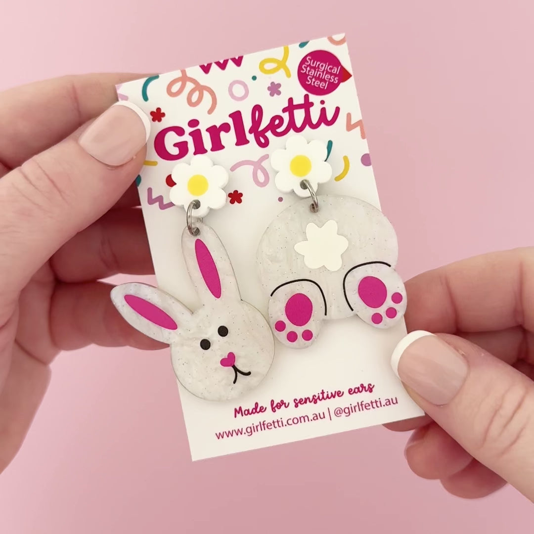 Bunny Mismatch Acrylic Dangle Earrings are playful statement earrings designed for anyone who loves fun seasonal jewellery. This adorable mismatched pair features a sweet white bunny face on one earring and a fluffy bunny butt on the other, creating a charming accessory that adds a touch of Easter magic to any outfit.