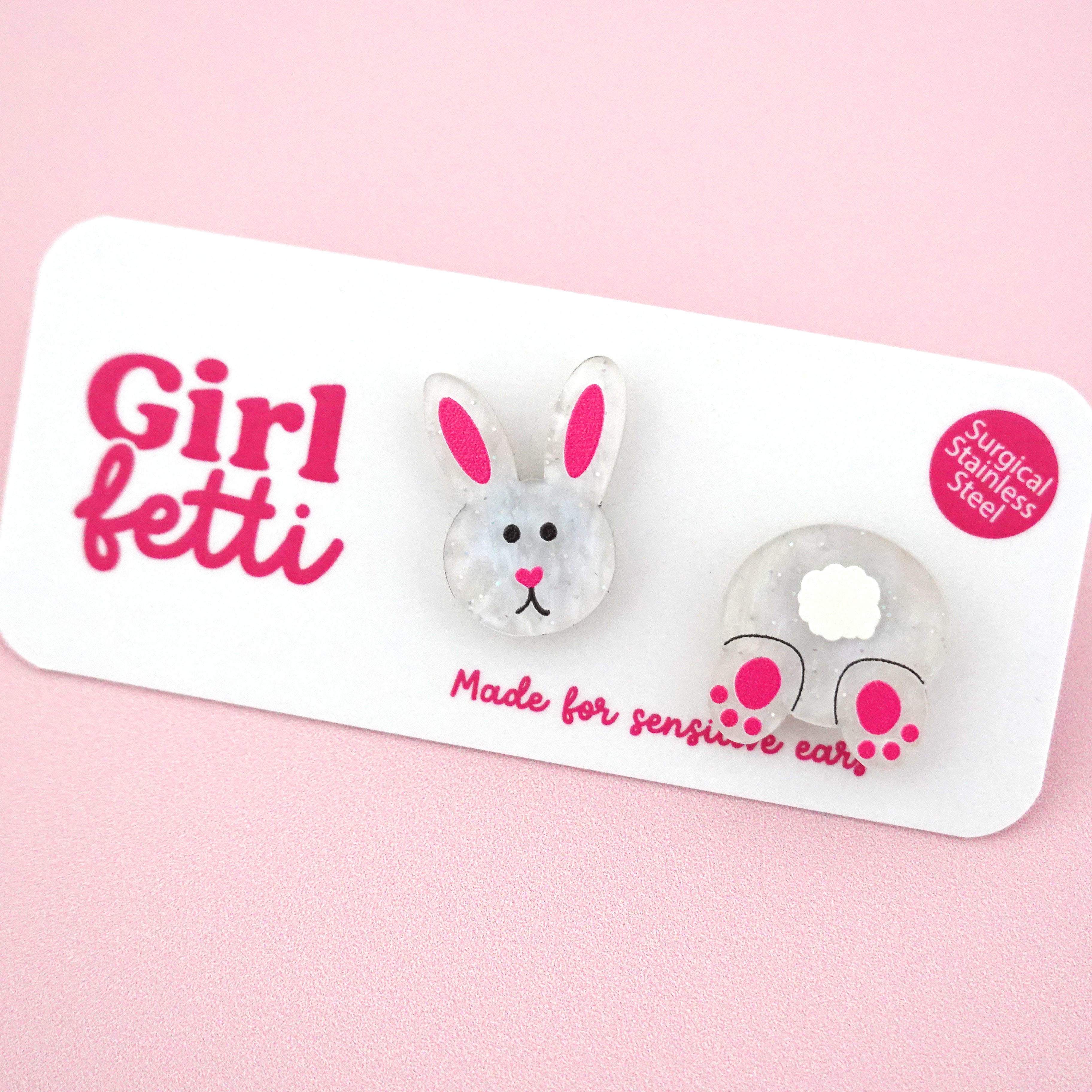 Bunny Mismatch Acrylic Stud Earrings are cute and playful earrings designed for anyone who loves fun seasonal jewellery. This mismatched pair features a sweet white bunny face on one ear and a fluffy bunny butt on the other, creating an adorable Easter-inspired accessory that is sure to spark smiles.