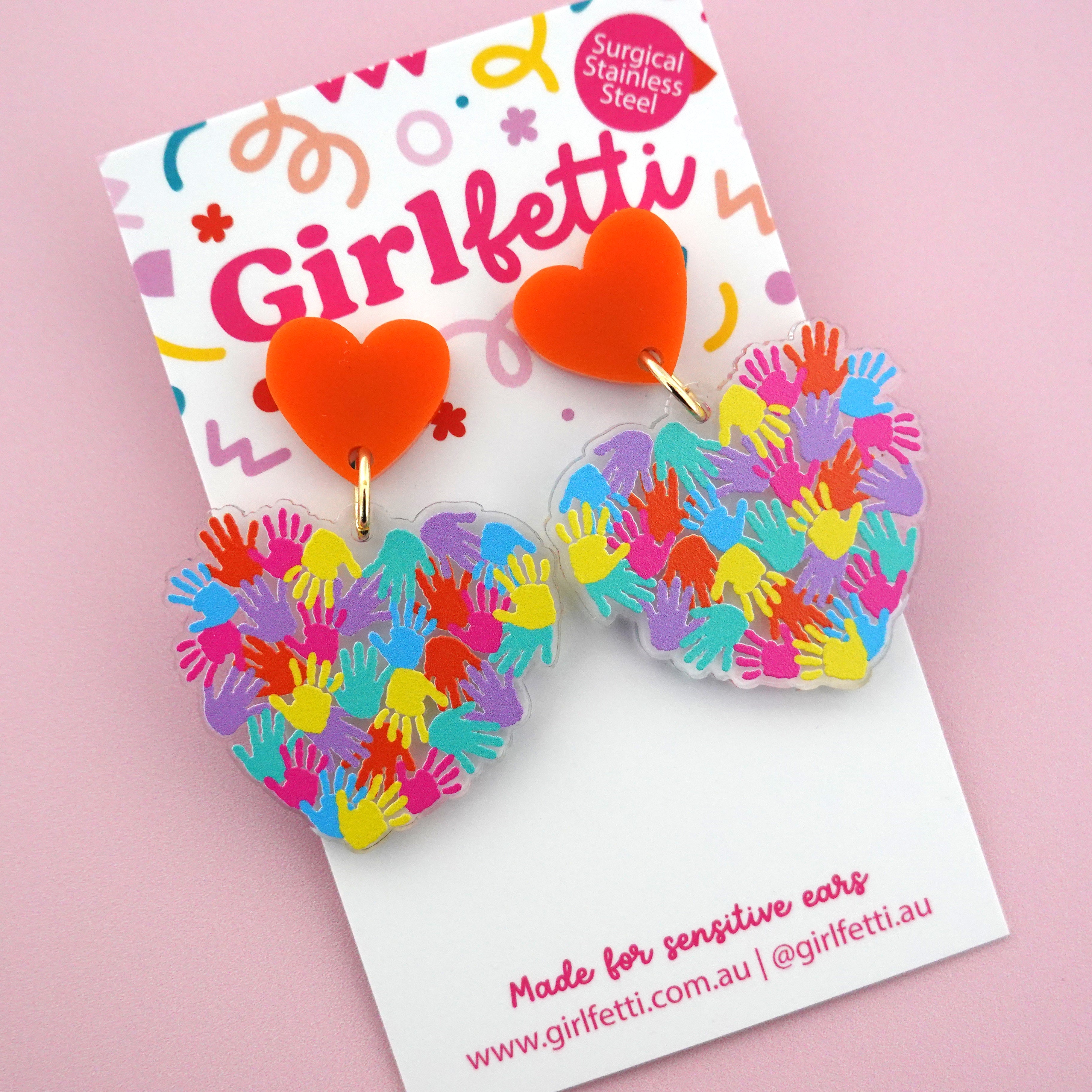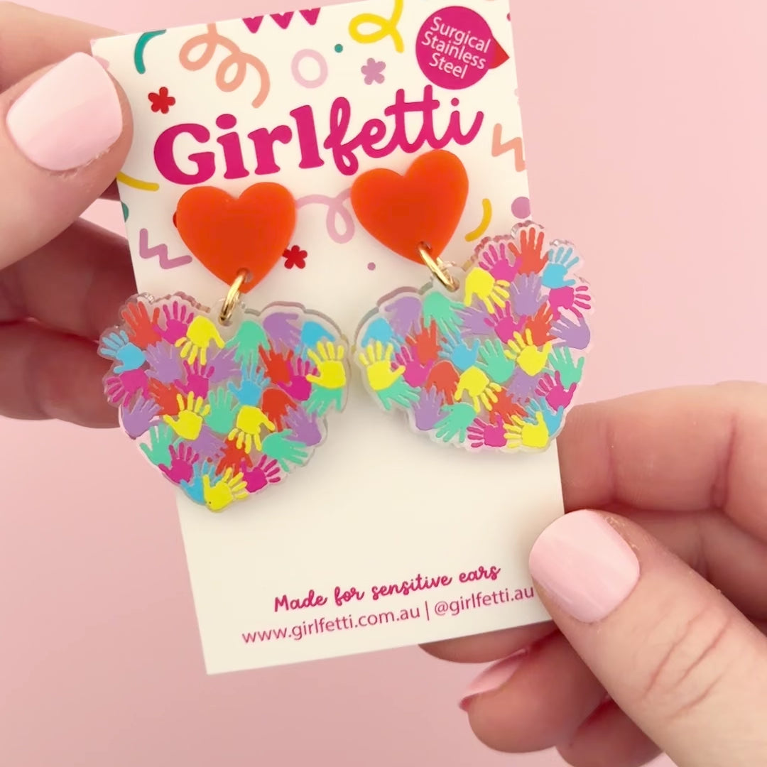 Our 'Heart of Hands Dangle Earrings' make the perfect accessory to wear as you are creating your classroom handprints this Harmony Day.