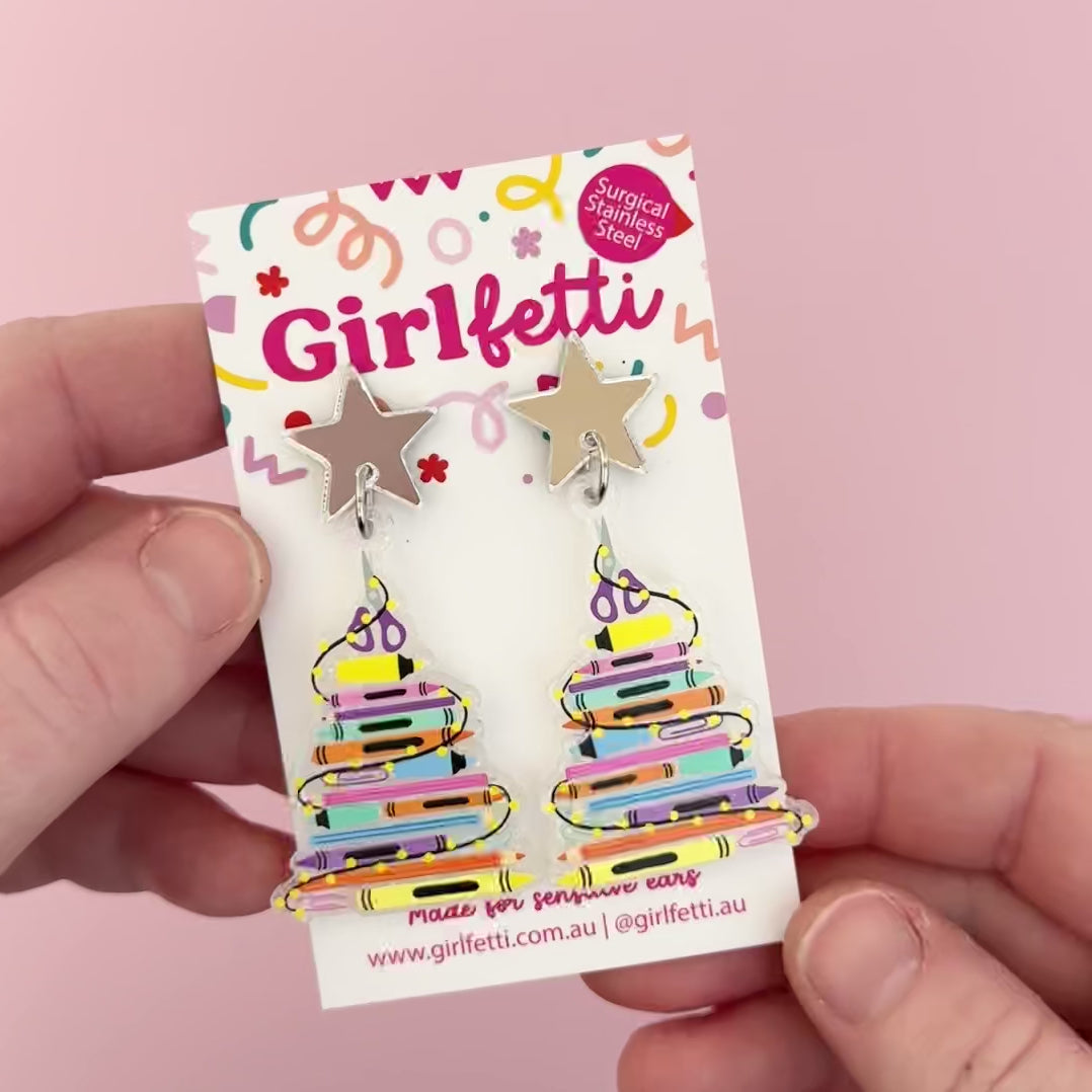 Our 'Stationery Christmas Tree Dangles' are the fun way to easily add a bit of Christmas cheer to any outfit.