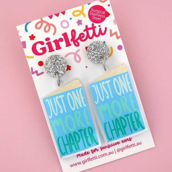 Have you ever thought to yourself 'just one more chapter' when you have to put your book away? Our popular 'Just one more chapter' book cover dangles let you express this feel through your earrings. These dangles are the ultimate accessory for teachers celebrating book week, librarians, end of year teacher gifts or simply if you love reading.