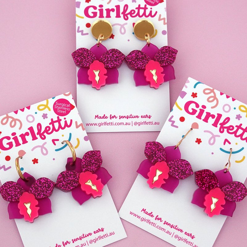 Materials: 3mm premium matte translucent acrylic base with 3mm acrylic detailing (glitter, matte and mirror) adhered on top. Stud top, hooks and hoops are hypoallergenic 304 stainless steel. Please note that this design is a little heavier than our standard single layer designs.